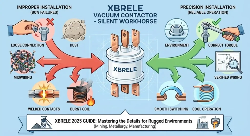 En XBRELE, diseñamos nuestro Serie de contactores de vacío para soportar las duras condiciones de la minería, la metalurgia y la industria pesada. Sin embargo, en nuestras décadas de apoyo a los fabricantes de paneles y los gestores de instalaciones, hemos observado que el 80% de los fallos en los equipos, desde contactos soldados hasta bobinas quemadas, no se deben a defectos de fabricación, sino a una instalación incorrecta o a errores de cableado.